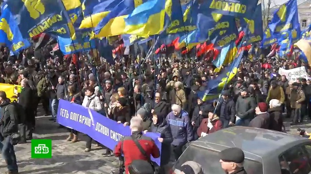 Единомышленники националистических партий Украины «Свобода», «Национальный корпус», которая была создана на базе националистического батальона «Азов» (Россия возбудила против их участников уголовные дела) и «Правый сектор» (организация, запрещенная в РФ) вышли на митинг против олигархов в самом центре Киева, сообщает РИА Новости. В руках участники акции несут флаги, на которых изображена партийная символика.