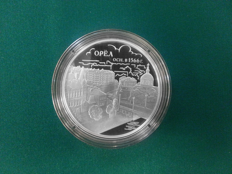 Как сообщили в ведомстве, новая серебряная монета будет круглой формы диаметром 39 мм. На ней изображены Государственный герб РФ и надписи: «Российская Федерация», «Банк России», «3 рубля» и «2016 г.». На другой стороне рельефные достопримечательности города Орла и год его заложения (1566 г.)