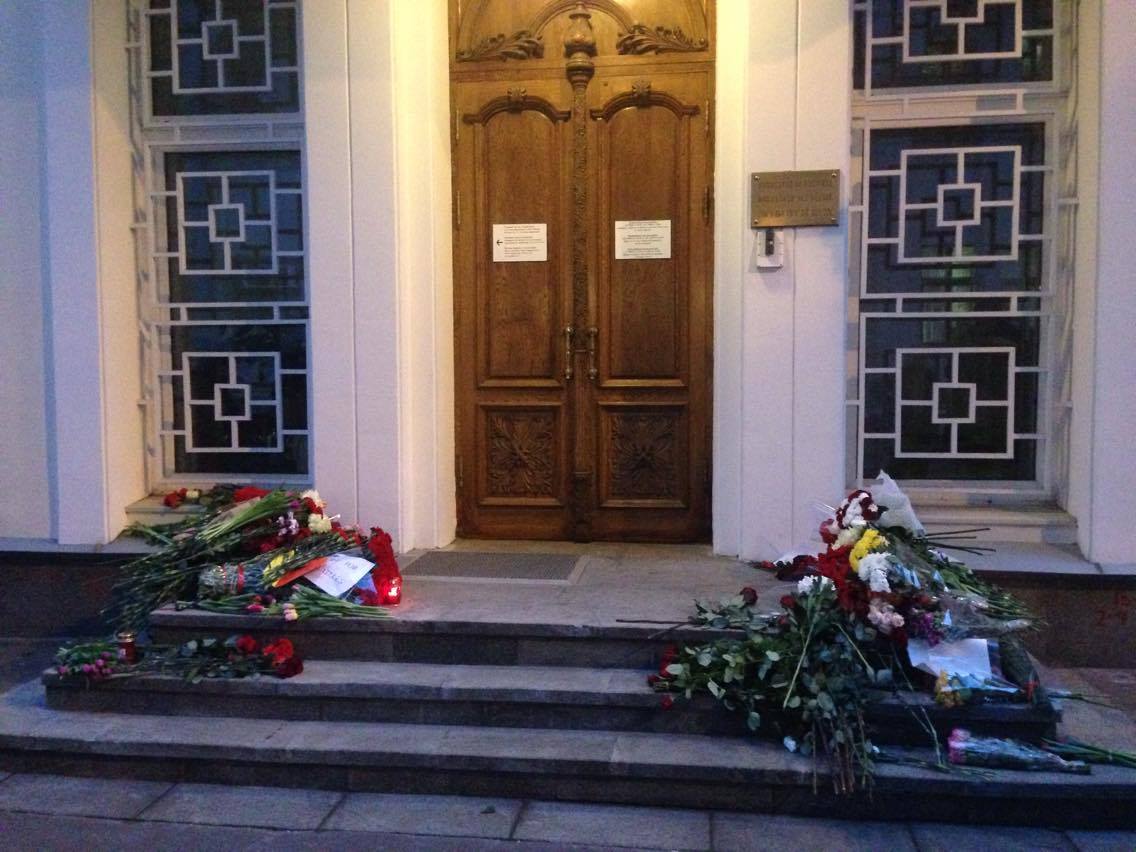 Москвичи продолжают нести цветы к посольству Бельгии в России