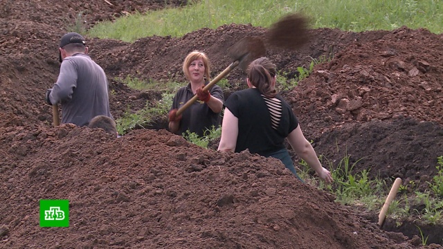 Десятки добровольцев копают оборонительные рвы для армии ДНР
