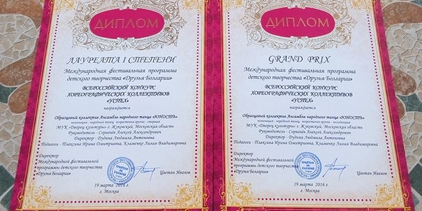 Ансамбль народного танца «Юность» при Дворце культуры города Жуковский получил высшую оценку жюри и удостоен гран-при Всероссийского конкурса хореографических коллективов «Успех», проведённого при содействии посольства Болгарии в Московском культурном фольклорном центре. nsn.fm »