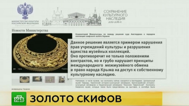 Решение суда Амстердама вернуть скифское золото Киеву является свидетельством действенности международного права, заявило министерство иностранных дел Украины. «Решение о возвращении скифских драгоценностей Украине, принятое на основании положений конвенции ЮНЕСКО 1970 года о мерах, направленных на запрещение и предотвращение незаконного ввоза, вывоза и передачи права собственности на культурные ценности, является свидетельством действенности международного права Украина продолжит активно использовать договорно-правовой инструментарий для защиты своих прав и законных интересов в международных и иностранных юрисдикционных органах», говорится в заявлении на сайте украинского внешнеполитического ведомства. vz.ru »